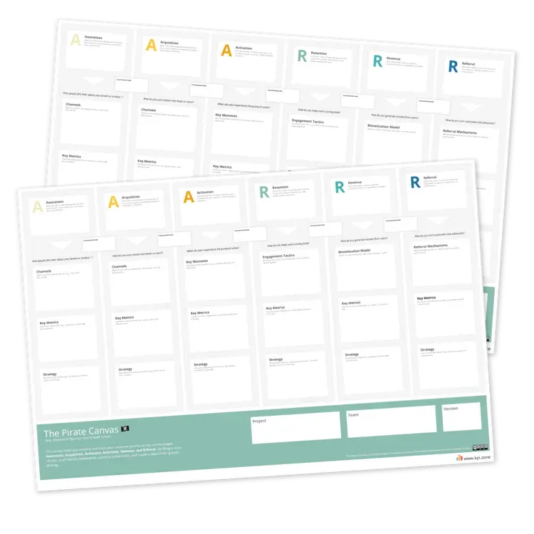 The Pirate Canvas is a visual framework for mapping your complete growth funnel across all six AAARRR stages.